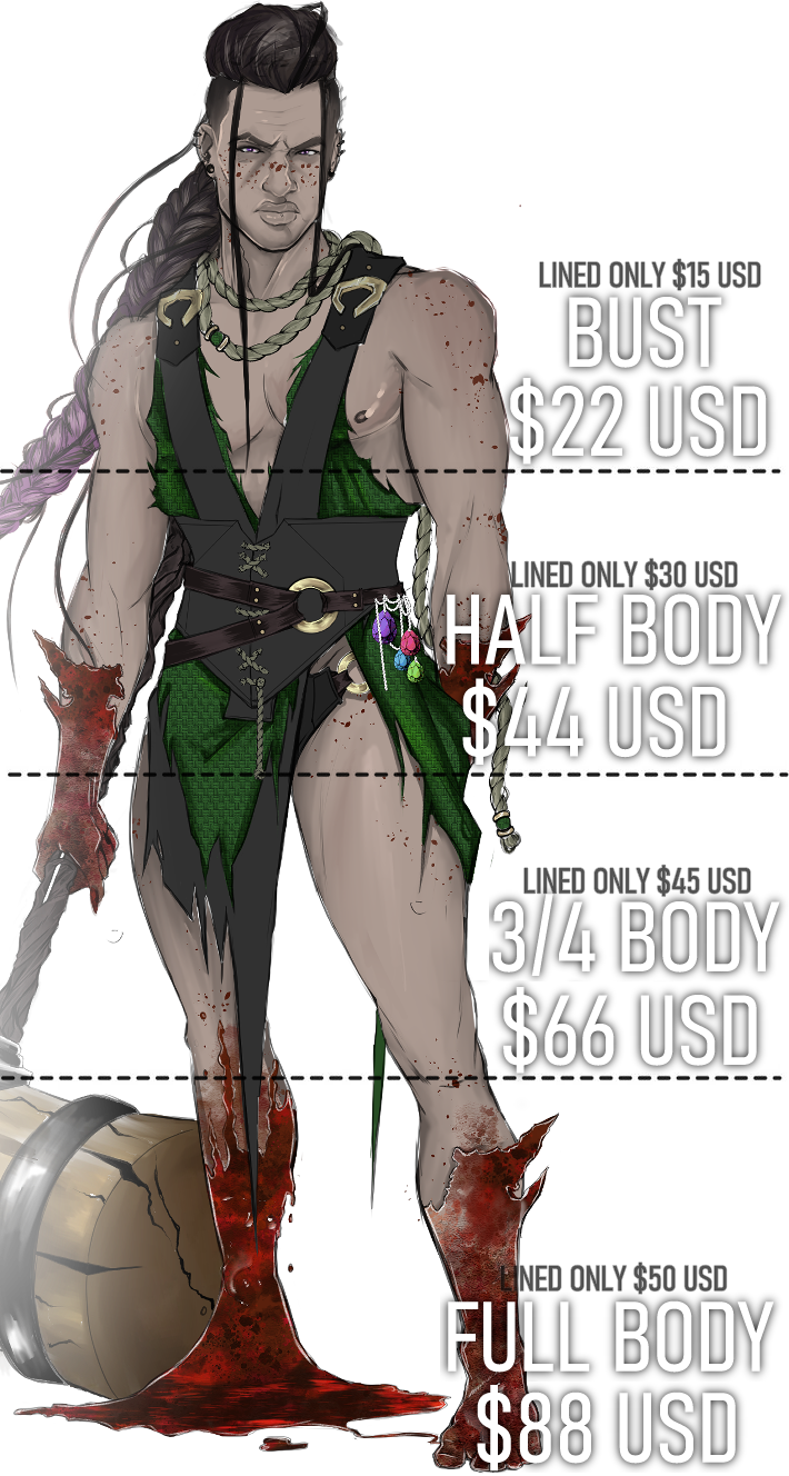 HALF BODY LINEART ONLY: $30 USD3/4 BODY FULL COLOR: $66 USD